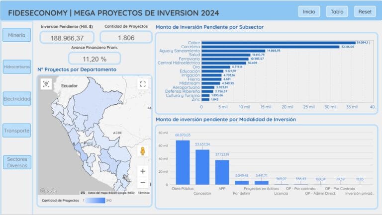Portafolio de megaproyectos de inversión en el Perú Dashboard que sistematiza alrededor de 1,500 proyectos de inversión pública y/o privada en el país. Permite a: Empresas constructoras identificar proyectos para postularEmpresas proveedoras detectar oportunidades de negocioÁreas comerciales y de planeamiento anticipar demanda futuraPresentación: Integra visualizaciones dinámicas y un mapa georreferenciado que permiten analizar de manera clara y rápida la situación de cada proyecto, destacando:Estado y clasificación del proyectoSector y ubicación geográficaMonto total de inversiónAvance financiero y saldo pendienteCronograma y entidad ejecutora CONTÁCTANOS ¿Tienes alguna pregunta? Estamos aquí para asesorarte. Ponte en contacto
